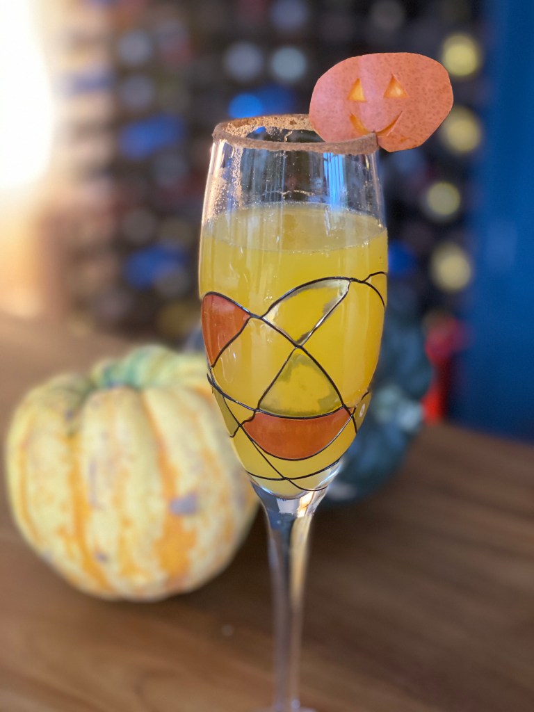 A seasonal take on the famous peach bellini, but rather than using peach puree, this one uses pumpkin puree (boiled pumpkin, blitzed with cloudy apple juice and a pinch of ground ginger). It also has spiced rim for an extra seasonal touch.