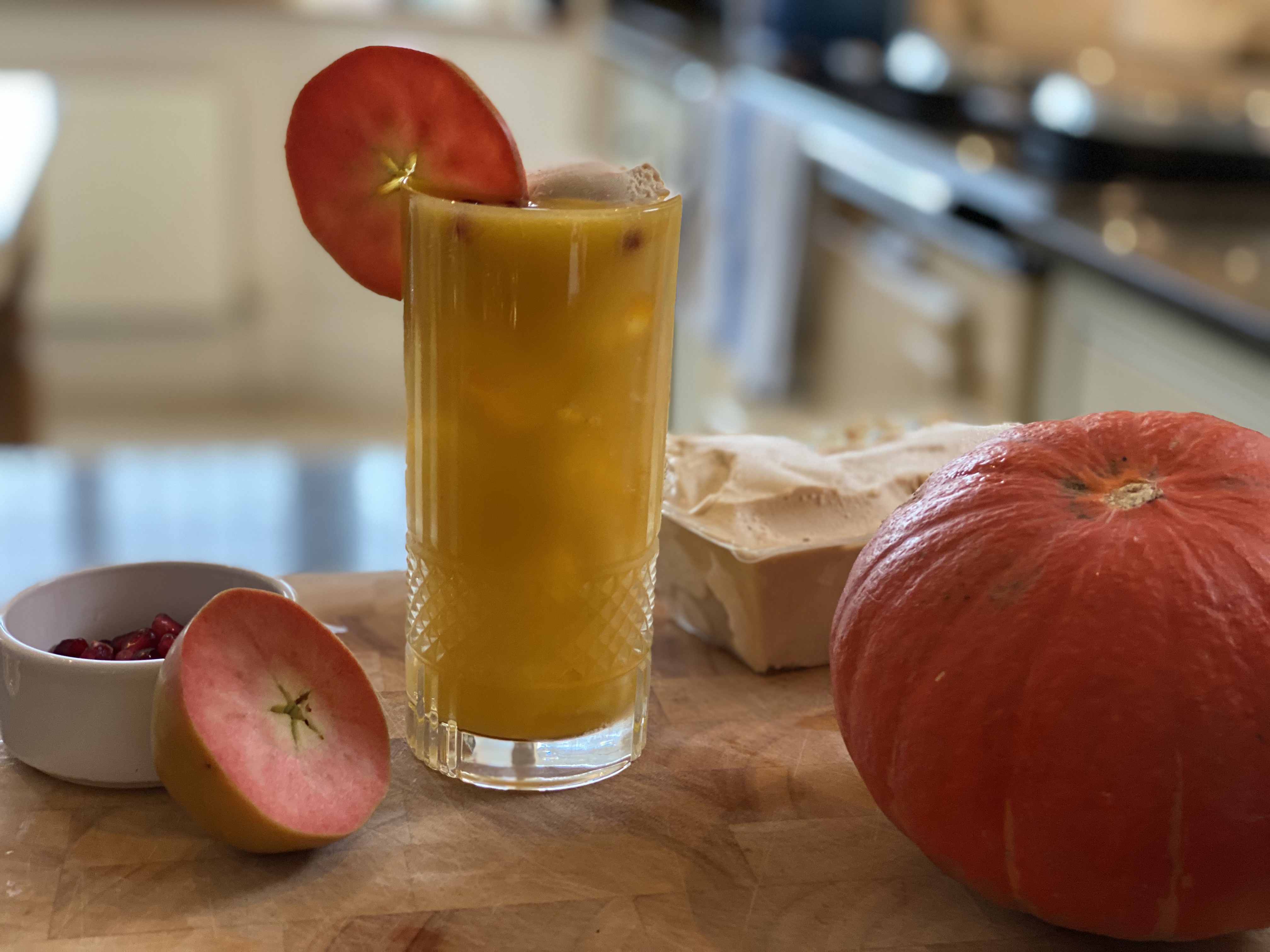 A seasonal take on the famous peach bellini, but rather than using peach puree, this one uses pumpkin puree (boiled pumpkin, blitzed with cloudy apple juice and a pinch of ground ginger). It also has spiced rim for an extra seasonal touch.