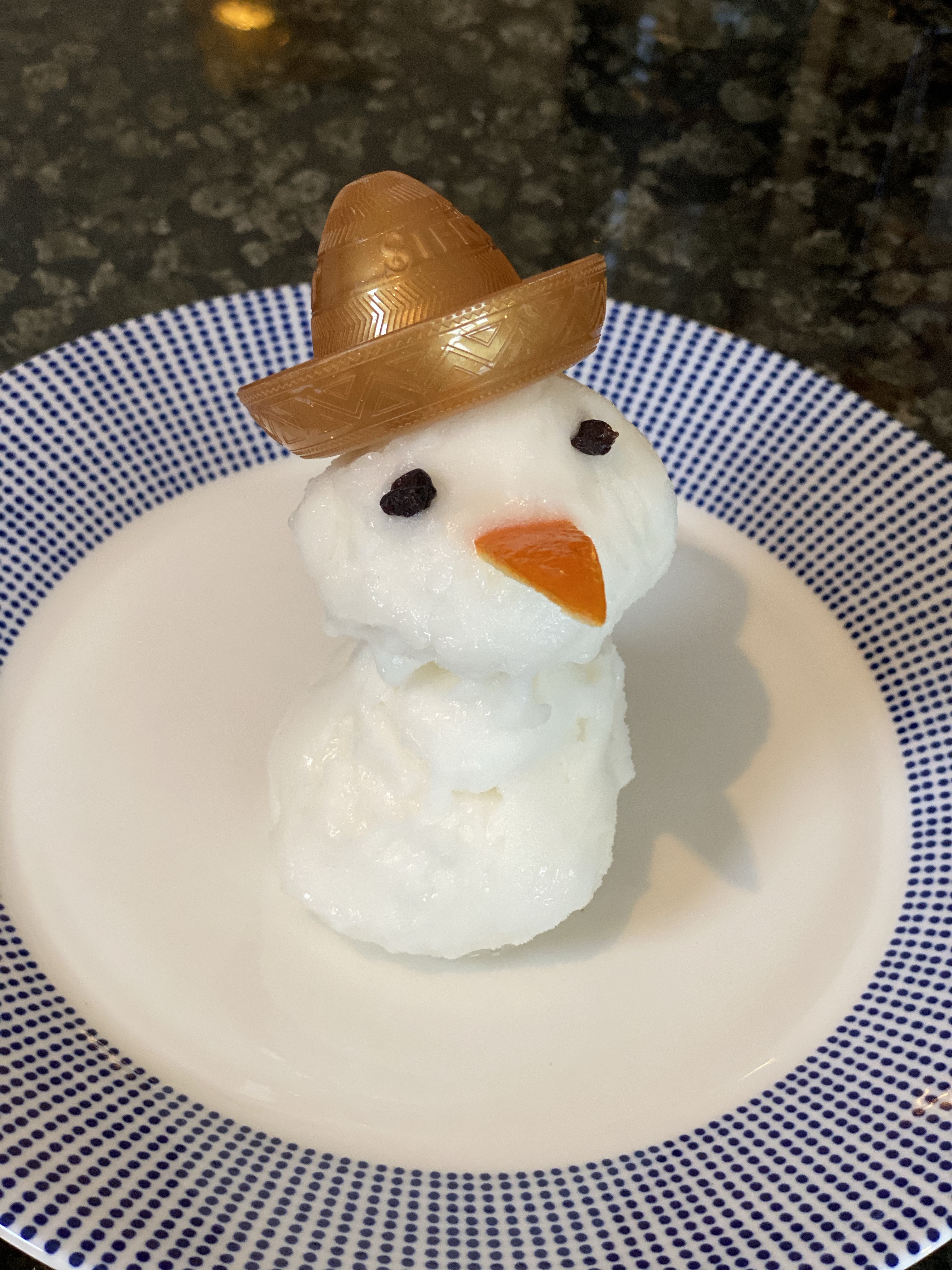 Scoop the sorbet / ice cream into the glass (a smaller scoop on top). Add the clementine / orange nose and choc chip / currant eyes. If you have a hat, fab! Pour over the lemonade / crème soda and watch your snowman (or lady) melt. Spoon or drink and enjoy!