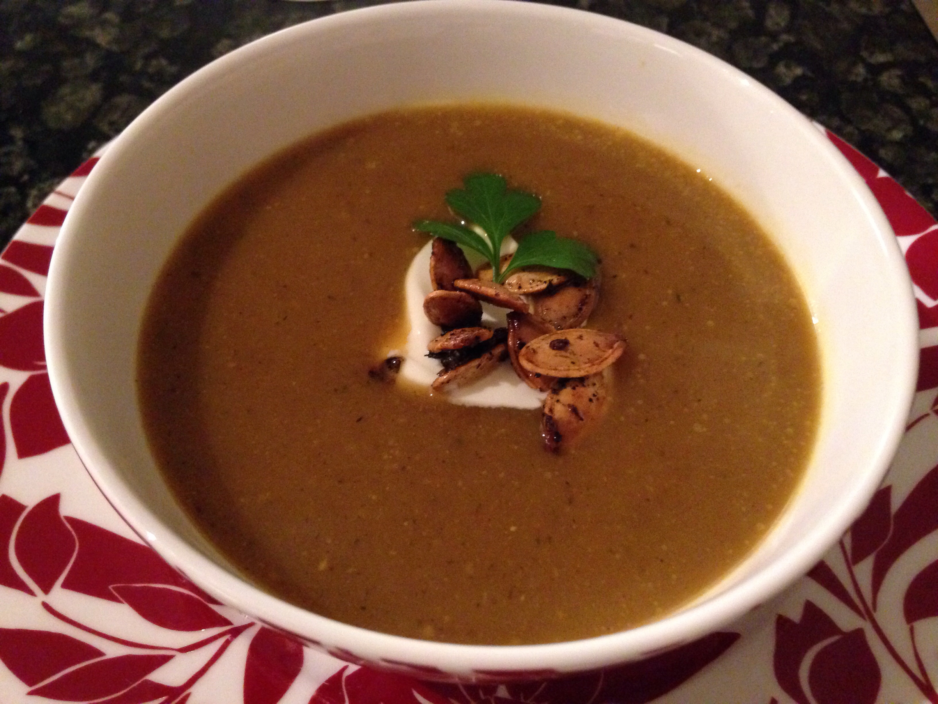 My serving suggestion is to add a large dollop of crème fraîche to the centre of the soup so that it can be stirred in, this healthy soup into something a bit more luxurious and then scatter with the pumpkin seeds and a sprig of parsley.